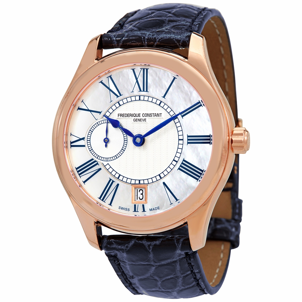 Rose gold-PVD polished stainless steel case with a navy alligator leather strap. Fixed bezel. Mother of pearl dial with blue hands and Roman numeral hour markers. Dial Type: Analog. Date display at the 6 o'clock position. One subdial displaying: one- small seconds. Frederique Constant Calibre FC-318 automatic movement with a 38-hour power reserve. Scratch resistant sapphire crystal. Pull / push crown. Transparent see through case back. Round case shape, case size: 36 mm. Water resistant at 50 meters / 165 feet. Functions: date, hour, minute, second. Watch label: Swiss Made. Frederique Constant Automatic Ladies Watch FC-318MPWN3B4.