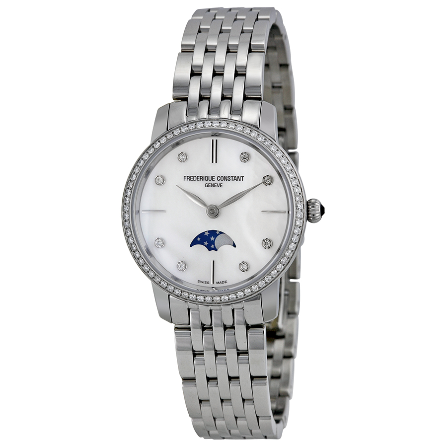 Stainless steel case with a stainless steel bracelet. Fixed stainless steel bezel set with diamonds. White mother of pearl dial with silver-tone leaf-style hands and diamond hour markers. Index markers at the 3, 6, 9 and 12 o'clock positions. Dial Type: Analog. Moonphase display. Frederique Constant calibre FC-206 quartz movement. Scratch resistant sapphire crystal. Pull / push crown. Solid case back. Round case shape. Case size: 30 mm. Case thickness: 7.7 mm. Band width: 14 mm. Band length: 7 inches. Fold over clasp with a push button release. Water resistant at 30 meters / 100 feet. Functions: hour, minute, moonphase. Luxury watch style. Watch label: Swiss Made. Item Variations: FC 206MPWD1SD6B, FC.206MPWD1SD6B, FC206MPWD1SD6B. Frederique Constant Slimline Moonphase Mother of Pearl Diamond Dial Ladies Watch FC-206MPWD1SD6B.
