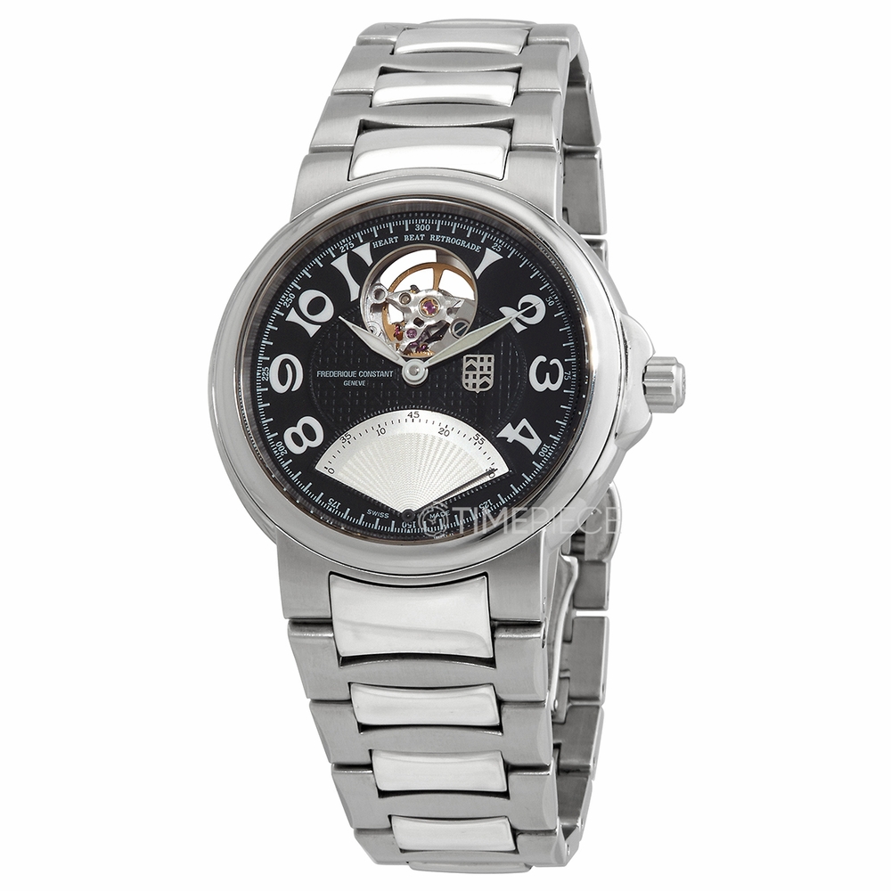 Stainless steel case with a stainless steel bracelet. Fixed stainless steel bezel. Black (open heart) dial with luminous silver-tone hands and Arabic numeral hour markers. Minute markers around the outer rim. Dial Type: Analog. Luminescent hands and markers. Retrograde seconds display. Automatic movement. Scratch resistant sapphire crystal. Pull / push crown. Transparent case back. Round case shape. Case size: 38 mm. Case thickness: 10.7 mm. Band width: 19 mm. Fold over clasp with a safety release. Water resistant at 50 meters / 165 feet. Functions: hour, minute, second. Highlife Series. Casual watch style. Watch label: Swiss Made. Frederique Constant Highlife Automatic Black Dial Mens Watch FC-680ABS3H6B.