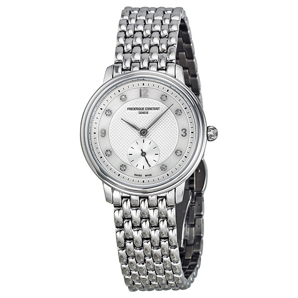 Stainless steel case with a stainless steel bracelet. Fixed stainless steel bezel. Mother of pearl dial with silver-tone leaf-style hands and diamond hour markers. Arabic numerals mark the 3, 9 and 12 o'clock positions. Minute markers around the outer rim. Dial Type: Analog. Small seconds sub-dial above the 6 o'clock position. Frederique Constant calibre FC-235 quartz movement. Scratch resistant sapphire crystal. Pull / push crown. Solid case back. Round case shape. Case size: 28 mm. Case thickness: 6 mm. Band width: 14 mm. Deployment clasp with a push button release. Water resistant at 30 meters / 100 feet. Functions: hour, minute, second. Dress watch style. Watch label: Swiss Made. Item Variations: FC 235MPWD1S6B, FC.235MPWD1S6B, FC235MPWD1S6B. Frederique Constant Slim Line Diamond Stainless Steel Ladies Watch 235MPWD1S6B.