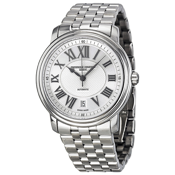 Stainless steel case with a stainless steel bracelet. Fixed stainless steel bezel. Silver guilloche dial with dark grey hands and Roman numeral hour markers. Minute markers around the outer rim. Dial Type: Analog. Date display at the 6 o'clock position. Frederique Constant calibre FC-303 automatic movement with a 38-hour power reserve. Scratch resistant sapphire crystal. Pull / push crown. Transparent case back. Round case shape. Case size: 40 mm. Case thickness: 10 mm. Band width: 22 mm. Deployment clasp with a push button release. Water resistant at 60 meters / 200 feet. Functions: date, hour, minute, second. Dress watch style. Watch label: Swiss Made. Item Variations: FC 303NM4P6B2, FC.303NM4P6B2, FC303NM4P6B2. Frederique Constant Persuasion Automatic Silver Dial Mens Watch 303NM4P6B2.