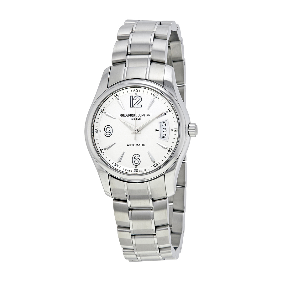 Silver-tone stainless steel case with a silver-tone stainless steel bracelet. Fixed silver-tone stainless steel bezel. Silver dial with luminous silver-tone dauphine-style shape hands and index hour markers. Arabic numerals mark the 6, 9 and 12 o'clock positions. minute markers around the outer rim. Dial Type: Analog. Luminescent hands and markers. Date display at the 3 o'clock position. Frederique Constant Calibre FC-303 Automatic movement, based upon Sellita SW200-1, containing 26 Jewels, bitting at 28800 vph, and has a power reserve of approximately 38 hours. Scratch resistant sapphire crystal. Pull / push crown. Solid with skeletal window case back. Round case shape, case size: 38.5 mm, case thickness: 10.7 mm. Band width: 20 mm. Deployment clasp. Water resistant at 60 meters / 200 feet. Functions: date, hour, minute, second. Additional Info: suitable for light splashing; not usually suitable for swimming; unsuitable for diving). Dress watch style. Watch label: Swiss Made. Frederique Constant Junior Silver Dial Mens Watch 303S4B26B.