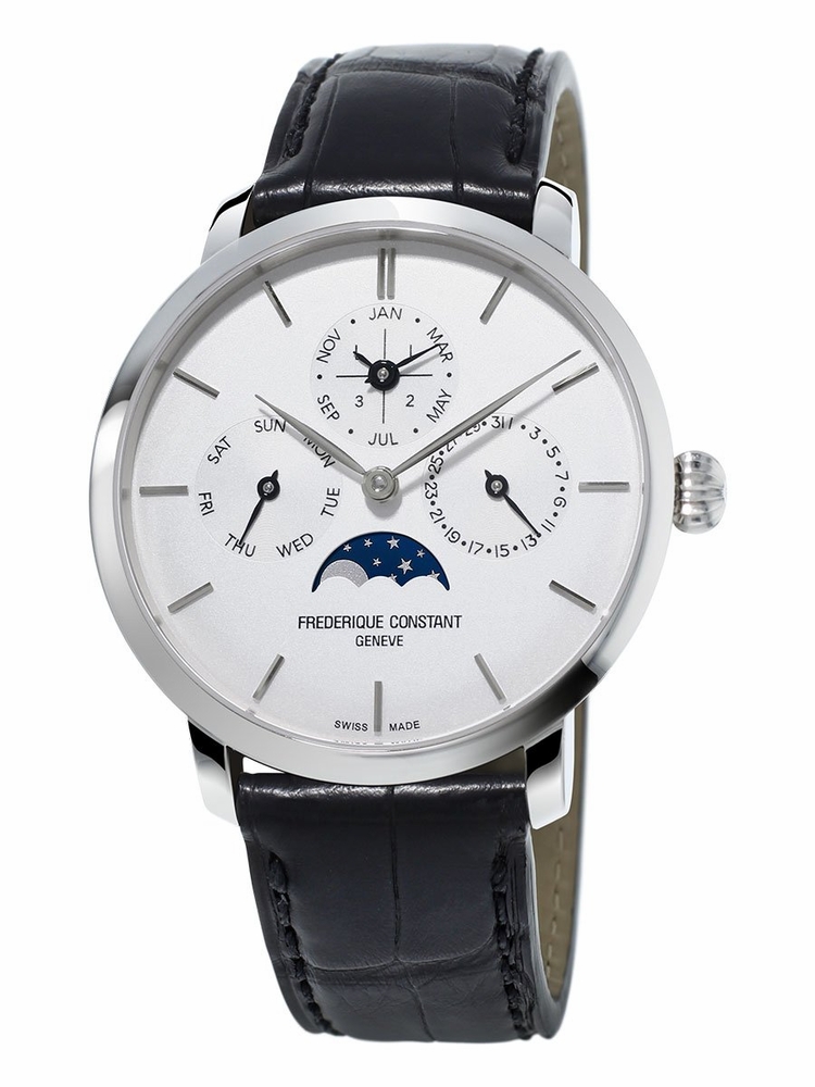 Stainless steel case with a black (alligator) leather strap. Fixed stainless steel bezel. Silver dial with silver-tone leaf-style hands and index hour markers. Dial Type: Analog. Date display at the 3 o'clock position. Four multi-function sub-dials displaying: date, day of the week , month/leap year and moonphase. Frederique Constant calibre FC-775 automatic movement, containing 26 Jewels, bitting at 28800 vph, and has a power reserve of approximately 38 hours. Scratch resistant sapphire crystal. Pull / push crown. Transparent case back. Round case shape. Case size: 42 mm. Case thickness: 12 mm. Band width: 21 mm. Tang clasp. Water resistant at 30 meters / 100 feet. Functions: moon phase, leap year, month, date, day, hour, minute. Slimline Series. Luxury watch style. Watch label: Swiss Made. Frederique Constant Slimline Perpetual Moon Phase Automatic Mens Watch 775S4S6.