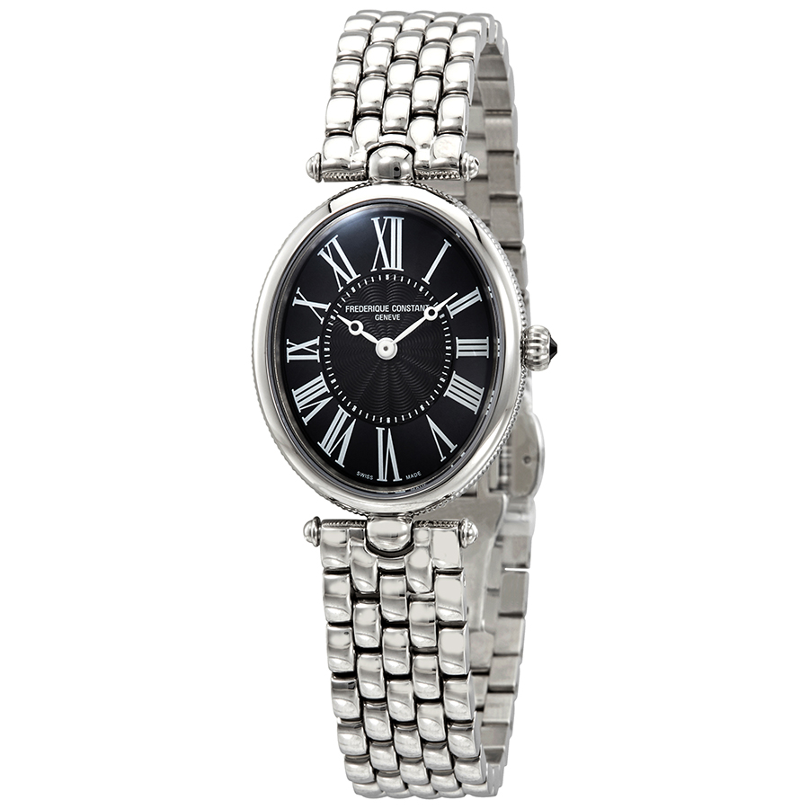 Silver-tone stainless steel case with a silver-tone stainless steel bracelet. Fixed silver-tone stainless steel bezel. Black mother of pearl dial with silver-tone Breguet-style shape hands and Roman numeral hour markers. Minute markers around an inner ring. Dial Type: Analog. Frederique Constant Calibre FC-200 quartz movement. Scratch resistant sapphire crystal. Pull / push crown. Solid case back. Oval case shape, case size: 30 x 25 mm, case thickness: 7 mm. Band width: 20 mm. Fold over with push button release clasp. Water resistant at 30 meters / 100 feet. Functions: hour, minute. Casual watch style. Watch label: Swiss Made. Frederique Constant Classics Art Deco Quartz Ladies Watch FC-200MPB2V6B.