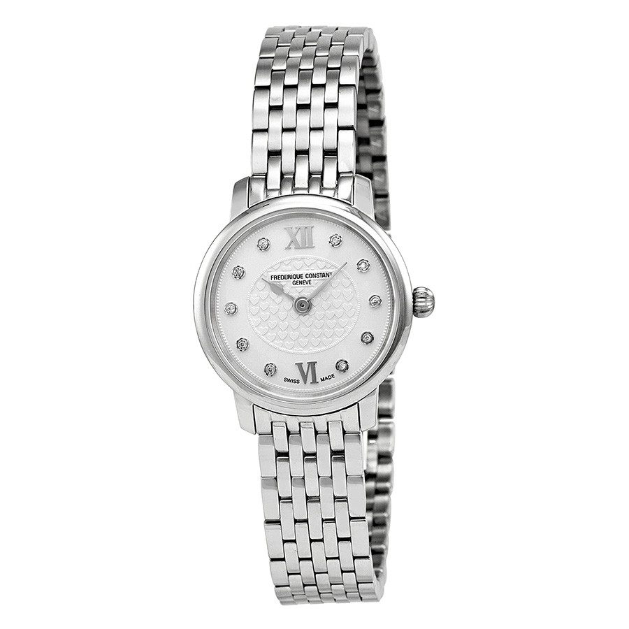 Silver-tone stainless steel case with a silver-tone stainless steel bracelet. Fixed silver-tone stainless steel bezel. Silver guilloche dial with silver-tone spade-shaped hands and diamond hour markers. Roman numerals mark the 6 and 12 o'clock positions. Dial Type: Analog. Frederique Constant Calibre FC-200 quartz movement. Scratch resistant sapphire crystal. Solid case back. Round case shape, case size: 25 mm, case thickness: 5.3 mm. Water resistant at 30 meters / 100 feet. Functions: hour, minute. Dress watch style. Watch label: Swiss Made. Item Variations: FC 200WHDS6B, FC.200WHDS6B, FC200WHDS6B. Frederique Constant Slim Line Mini Silver Dial Stainless Steel Watch FC-200WHDS6B.
