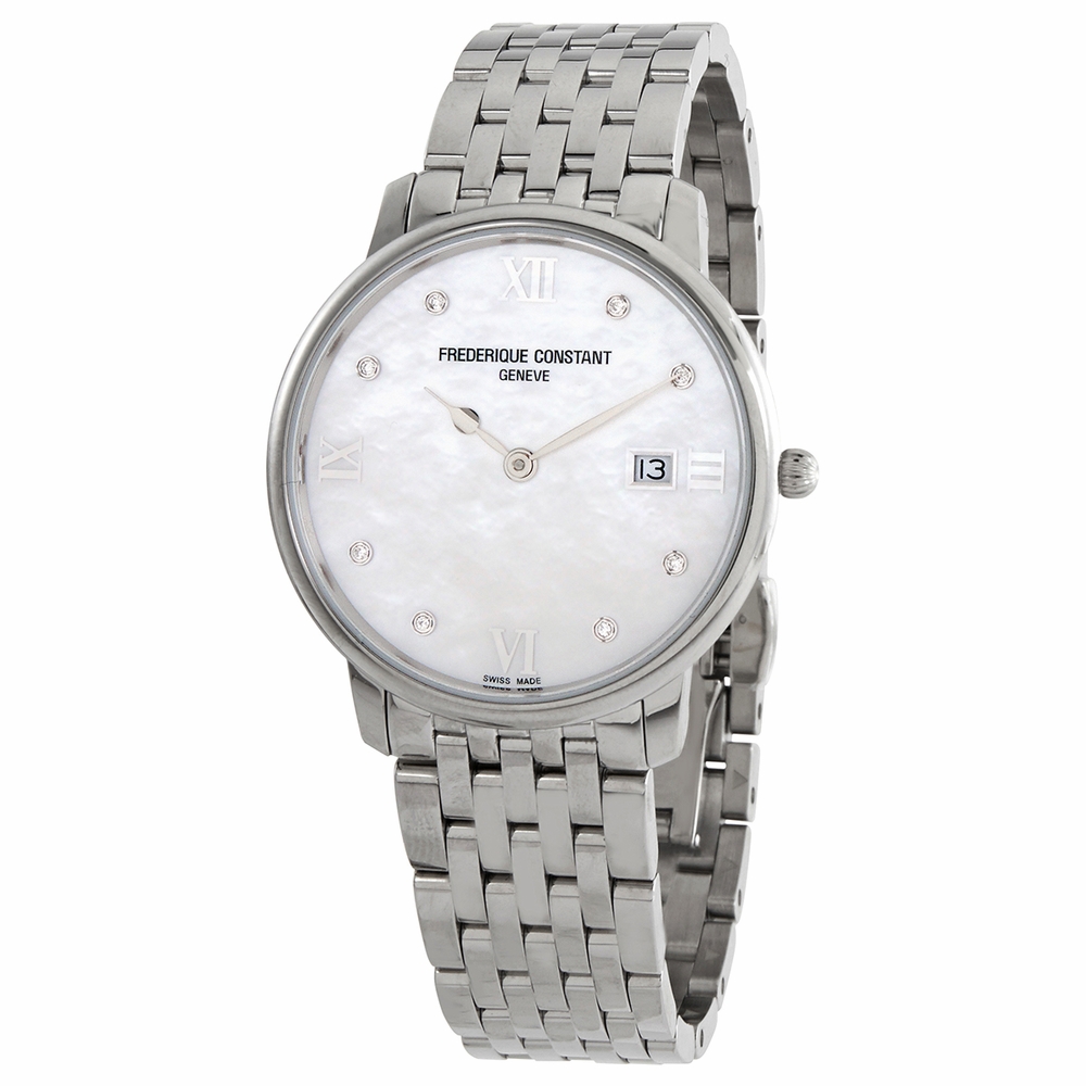 Silver-tone stainless steel case with a silver-tone stainless steel bracelet. Fixed bezel. Mother of pearl dial with silver-tone hands and Roman- diamond numerals hour markers. Dial Type: Analog. Date display at the 3 o'clock position. Frederique Constant Calibre FC-220 quartz movement. Solid case back. Round case shape. Case size: 36 mm. Water resistant at 30 meters / 100 feet. Functions: date, hour, minute. Watch label: Swiss Made. Frederique Constant Classics Slimline Quartz Diamond Ladies Watch FC-220MPWD3S6B.