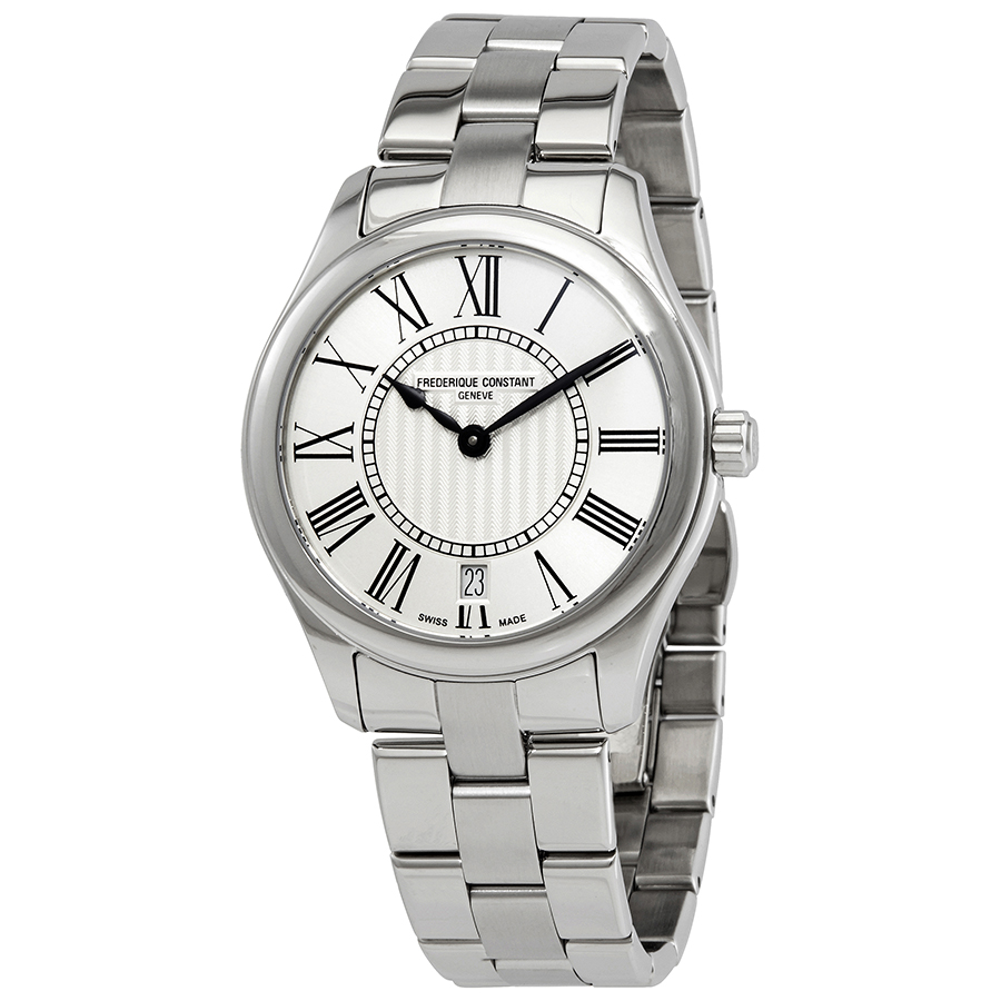 Stainless steel case with a stainless steel bracelet. Fixed stainless steel bezel. Silver dial with black hands and Roman numeral hour markers. Minute markers around an inner ring. Dial Type: Analog. Date display at the 6 o'clock position. Frederique Constant calibre FC-220 quartz movement. Scratch resistant convex sapphire crystal. Pull / push crown. Solid case back. Round case shape. Case size: 36 mm. Case thickness: 8 mm. Band width: 16 mm. Fold over with push button release clasp. Water resistant at 50 meters / 165 feet. Functions: date, hour, minute. Casual watch style. Watch label: Swiss Made. Frederique Constant Classics Silver Dial Ladies Watch FC-220MS3B6B.