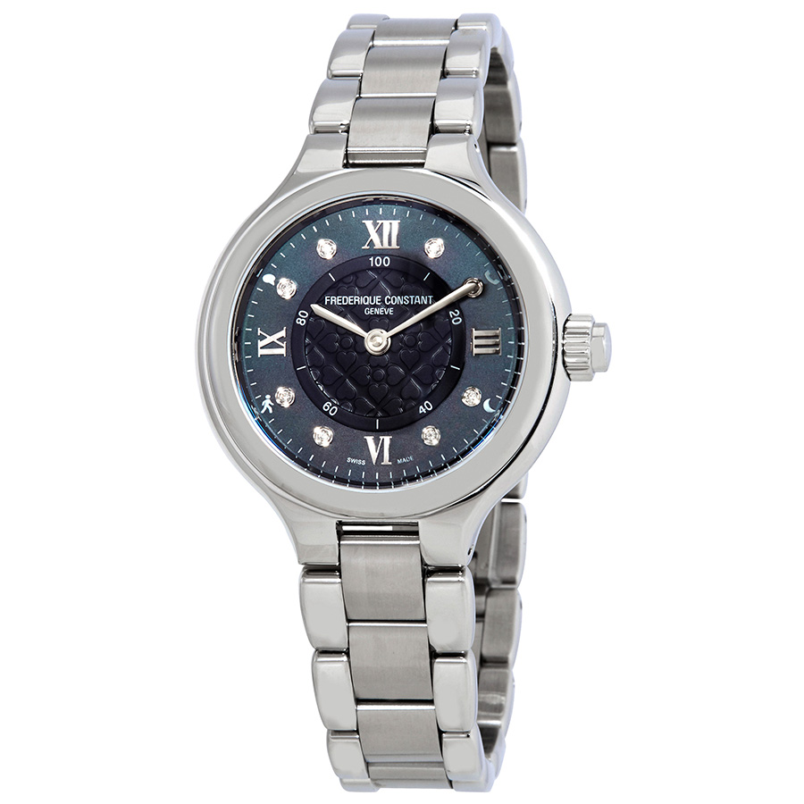 Stainless steel case with a stainless steel bracelet. Fixed stainless steel bezel. Dark grey, mother of pearl dial with silver-tone hands and diamond hour markers. Roman numerals mark the 3, 6, 9 and 12 o'clock positions. Minute markers around the outer rim. Frederique Constant calibre MMT-281 quartz movement. Scratch resistant sapphire crystal. Pull / push crown. Solid case back. Case size: 34 mm, case thickness: 11 mm. Round case shape. Band width: 15 mm. Deployment clasp. Water resistant at 30 meters / 100 feet. Functions: hour, minute. Additional Info: activity tracking, call notification, sleep monitoring, and text notifications. Luxury watch style. Watch label: Swiss Made. Frederique Constant Smarwatch Grey Mother of Pearl Ladies Watch FC-281GHD3ER6B.