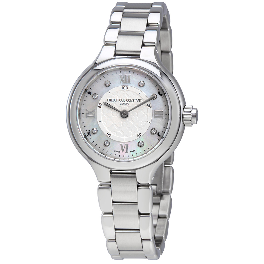 Stainless steel case with a stainless steel bracelet. Fixed stainless steel bezel. Silver dial with silver-tone hands and diamond hour markers. Roman numerals mark the 3, 6, 9 and 12 o'clock position. Minute markers around the outer rim. Dial Type: Analog. Frederique Constant calibre MMT-281 quartz movement. Scratch resistant sapphire crystal. Solid case back. Round case shape. Case size: 34 mm. Case thickness: 11.04 mm. Fold over clasp. Water resistant at 30 meters / 100 feet. Functions: hour, minute, activity tracker, active alerts, dynamic coach, sleep monitoring, smart alarm, worldtimer, notifications, cloud storage. Dress watch style. Watch label: Swiss Made. Frederique Constant Silver Dial Ladies Horological Smartwatch FC-281WHD3ER6B.
