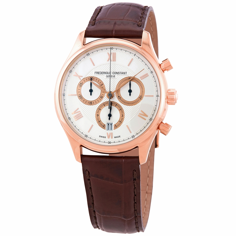 Rose gold-tone stainless steel case with a brown leather strap. Fixed rose gold-tone stainless steel bezel. Silver dial with rose gold-tone hands and Roman numeral hour markers. Dial Type: Analog. Date display at the 6 o'clock position. Chronograph - sub-dials displaying: three - 60 second, 30 minute and 12 hour. Frederique Constant Calibre FC-292 quartz movement. Scratch resistant sapphire crystal. Solid case back. Round case shape. Case size: 40 mm. Water resistant at 50 meters / 165 feet. Functions: date, hour, minute, second. Sport watch style. Watch label: Swiss Made. Frederique Constant Quartz Silver Dial Mens Watch FC-292MVG5B4.