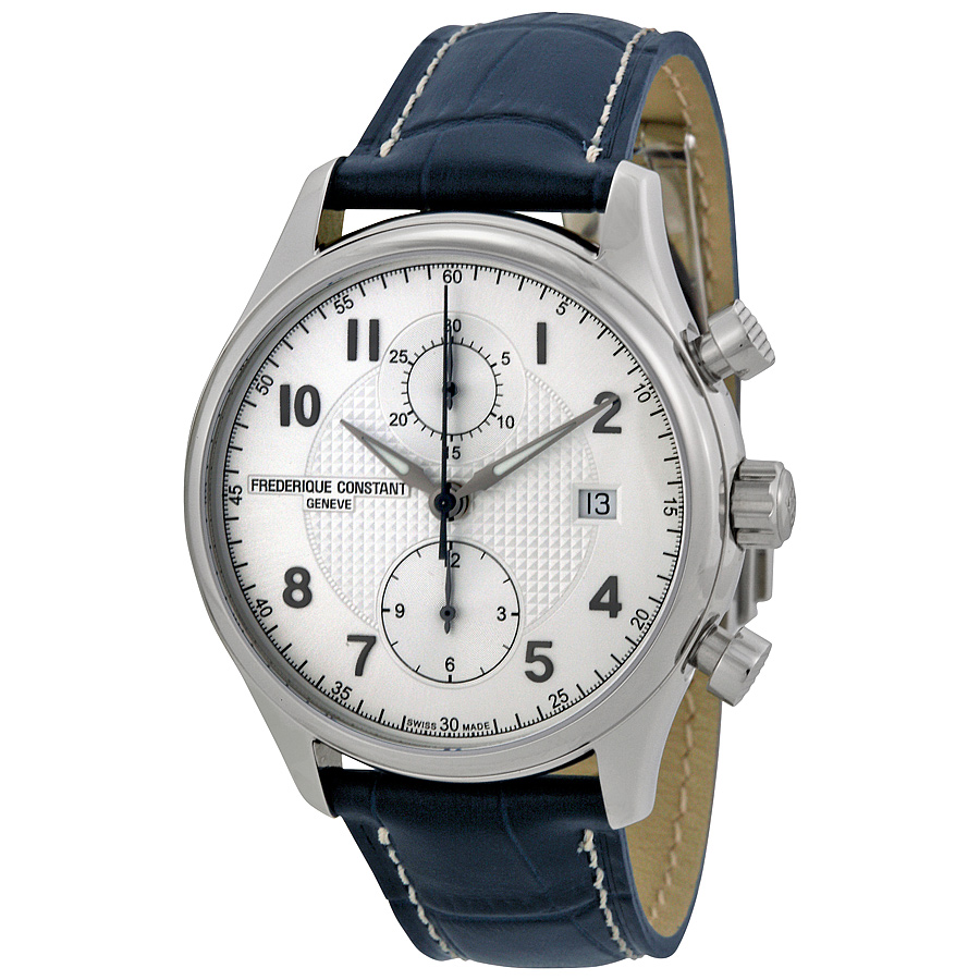 Stainless steel case with a blue (calfskin) leather strap. Fixed stainless steel bezel. Silver dial with luminous silver-tone alpha-style hands and Arabic numeral hour markers. Minute markers around the outer rim. Dial Type: Analog. Luminescent hands. Date display at the 3 o'clock position. Chronograph - two sub-dials displaying:12 hour and 30 minute. Frederique Constant calibre FC-393 automatic movement, containing 25 Jewels, bitting at 28800 vph, and has a power reserve of approximately 46 hours. Scratch resistant sapphire crystal. Screw down crown. Skeleton case back. Round case shape. Case size: 42 mm. Case thickness: 15 mm. Band width: 20 mm. Deployment clasp. Water resistant at 50 meters / 165 feet. Functions: chronograph, date, hour, minute, second. Luxury watch style. Watch label: Swiss Made. Item Variations: FC 393RM5B6, FC.393RM5B6, FC393RM5B6. Frederique Constant Runabout Chronograph Automatic Mens Watch FC-393RM5B6.