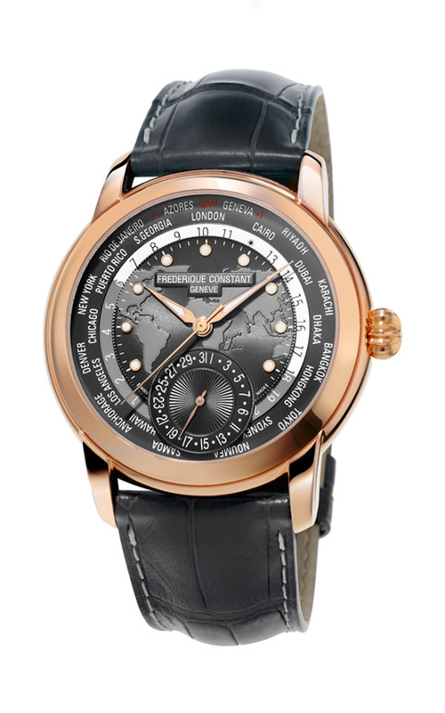 Rose gold-plated stainless steel case with a dark grey (alligator) leather strap. Fixed rose gold-plated bezel. Dark grey dial with luminous rose gold-plated alpha-style hands and dot hour markers. Minute markers. 24 hour markings. World time cities around the outer rim. Dial Type: Analog. Luminescent hands and markers. Date subdial. Date sub-dial at the 6 o'clock position. Frederique Constant calibre FC-718 Automatic movement, containing 26 Jewels, composed of 161 parts, bitting at 28800 vph, and has a power reserve of approximately 42 hours. Scratch resistant sapphire crystal. Pull / push crown. Transparent case back. Round case shape. Case size: 42 mm. Case thickness: 12.1 mm. Band width: 20 mm. Fold over clasp. Water resistant at 50 meters / 165 feet. Functions: world time, date, GMT, second time zone, hour, minute, second. Classic Wolrdtimer Series. Travel watch style. Watch label: Swiss Made. Frederique Constant Classic Wolrdtimer Automatic Dark Grey Dial Mens Watch FC-718DGWM4H4.