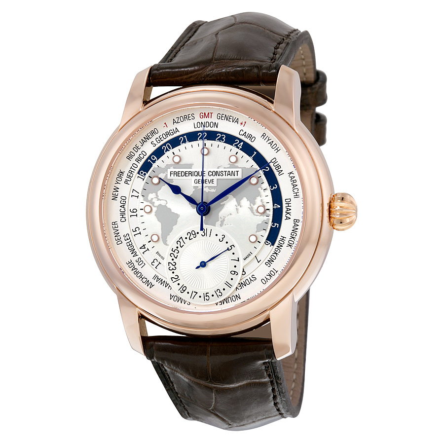 Rose gold-plated stainless steel case with a brown alligator leather strap. Fixed rose gold-plated stainless steel bezel. Silver map dial with blue spade-shaped hands and dot hour markers. 24 hour markers. minute markers. world time cities around the outer rim. Dial Type: Analog. Luminescent markers. Date display at the o'clock position. One subdial displaying: date. Frederique Constant Calibre FC-718 Automatic movement, containing 26 Jewels, composed of 161 parts, bitting at 28800 vph, and has a power reserve of approximately 42 hours. Scratch resistant sapphire crystal. Pull / push crown. Skeleton case back. Round case shape, case size: 42 mm, case thickness: 12.1 mm. Band width: 22 mm. Tang clasp. Water resistant at 50 meters / 165 feet. Functions: world time, GMT, second time zone, date, hour, minute, second. Worldtimer Series. Travel watch style. Watch label: Swiss Made. Item Variations: FC 718WM4H4, FC.718WM4H4, FC718WM4H4. Frederique Constant Worldtimer Automatic Silver Dial Mens Watch FC-718WM4H4.