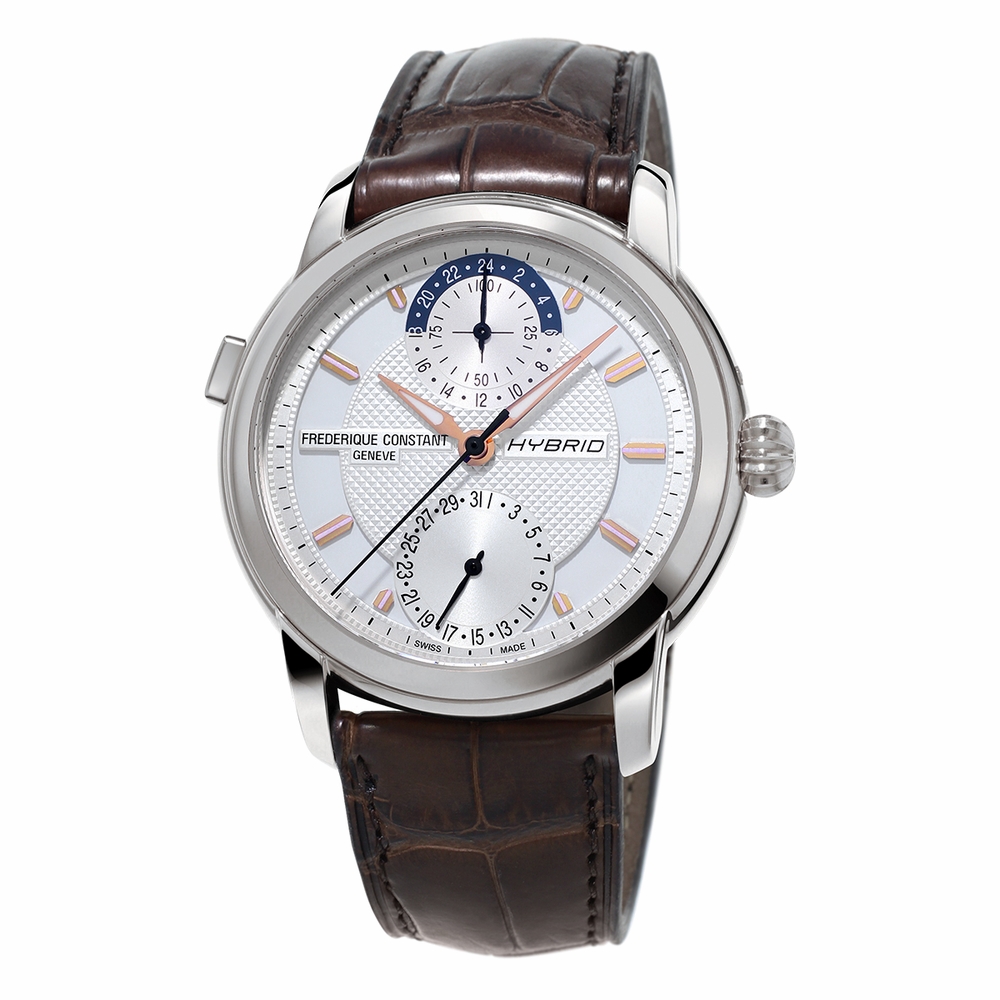 Silver-tone stainless steel case with a dark brown leather strap. Fixed silver-tone stainless steel bezel. Silver-tone dial with rose gold-tone alpha-style shape hands and index hour markers. Minute markers around the outer rim. Dial Type: Analog. Luminescent hands and markers. Date subdail - complete calender. Two sub-dials displaying: date and 24 hour. Frederique Constant Calibre FC-750 Automatic movement, containing 33 Jewels, bitting at 28800 vph, and has a power reserve of approximately 42 hours. Scratch resistant sapphire crystal. Onion crown pull / push crown. Transparent case back. Round case shape, case size: 42 mm. Band width: 22 mm. Buckle clasp. Water resistant at 50 meters / 165 feet. Functions: date, hour, minute, second, 24 hour, GMT, sleep monitoring, vibration / sound notifications / activity tracking. Classic Hybrid Series. Luxury watch style. Watch label: Swiss Made. Frederique Constant Classic Hybrid Automatic Silver Dial Mens Watch FC-750V4H6.