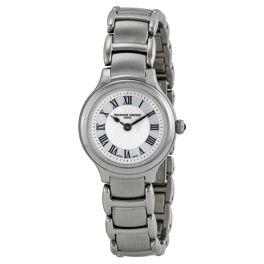 Stainless steel case with a stainless steel bracelet. Fixed stainless steel bezel. Mother of pearl (guilloche decoration) dial with black spade-shaped hands and Roman numeral hour markers. Minute markers around the outer rim. Dial Type: Analog. Frederique Constant calibre FC-200 quartz movement. Scratch resistant sapphire crystal. Pull / push crown. Solid case back. Round case shape. Case size: 26.5 mm. Case thickness: 7.4 mm. Band width: 14 mm. Fold over clasp. Water resistant at 30 meters / 100 feet. Functions: hour, minute. Casual watch style. Watch label: Swiss Made. Frederique Constant Delight Ladies Watch 200M1ER6B.