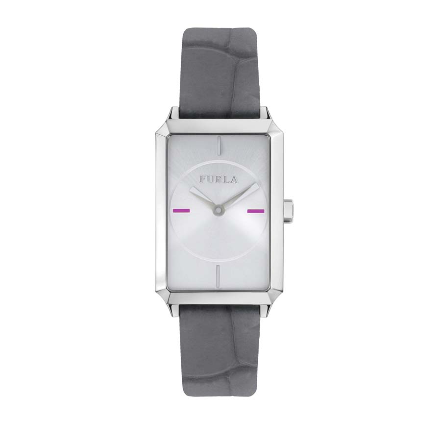 Silver-tone stainless steel case with a grey calfskin leather strap. Fixed silver-tone stainless steel bezel. Silver dial with silver-tone hands and index hour markers. Dial Type: Analog. Quartz movement. Scratch resistant mineral crystal. Push/pull crown. Solid case back. Rectangle case shape, case size: 32 x 22 mm, case thickness: 7.5 mm. Band width: 14 mm, band length: 7.5 inches. Buckle clasp. Water resistant at 30 meters / 99 feet. Functions: hour, minute. Casual watch style. Furla Diana Silver Dial Ladies Watch R4251104503.