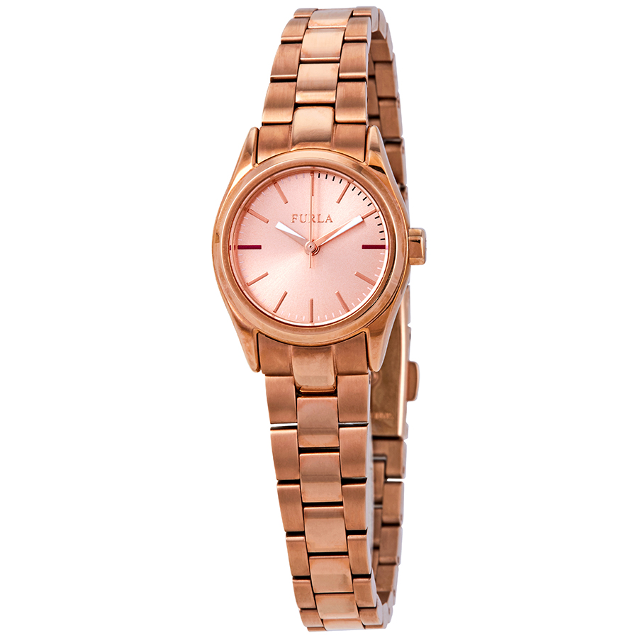Rose gold-tone stainless steel case with a rose gold-tone stainless steel bracelet. Fixed rose gold-tone stainless steel bezel. Rose gold-tone dial with rose gold-tone hands and index hour markers. Minute markers around the outer rim. Dial Type: Analog. Quartz movement. Scratch resistant mineral crystal. Pull / push crown. Solid case back. Round case shape, case size: 25 mm, case thickness: 8 mm. Band width: 18 mm. Deployment clasp. Water resistant at 50 meters / 165 feet. Functions: hour, minute, second. Casual watch style. Watch label: Japan Movt. Furla Eva Rose Gold Dial Ladies Watch R4253101505.