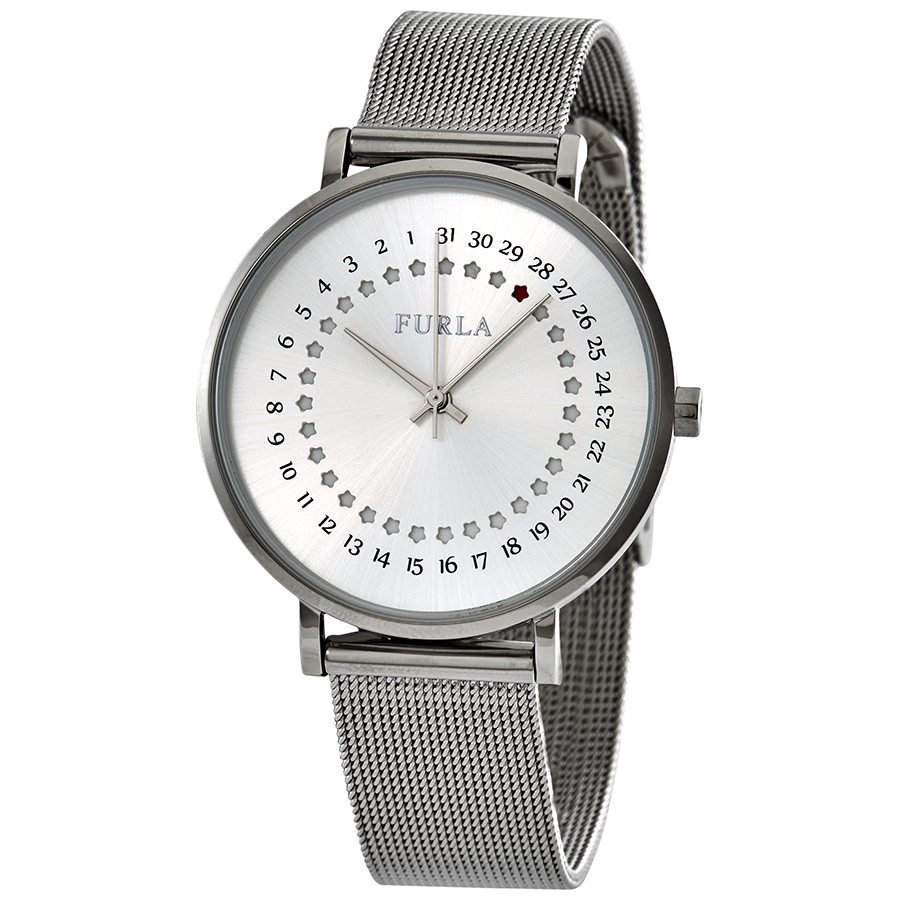 Silver-tone stainless steel case with a silver-tone stainless steel mesh bracelet. Fixed bezel. Silver-tone dial with silver-tone hands. Dial Type: Analog. Pointer date. Quartz movement. Scratch resistant mineral crystal. Pull / push crown. Solid case back. Round case shape. Case size: 36 mm. Water resistant at 50 meters / 165 feet. Functions: date, hour, minute, second. Casual watch style. Furla Giada Date Silver Dial Ladies Watch R4253121503.
