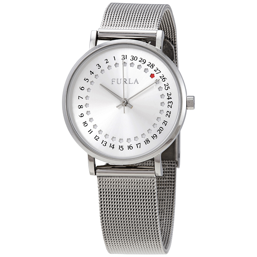 Silver-tone stainless steel case with a silver-tone stainless steel mesh bracelet. Fixed bezel. Silver dial with silver-tone hands. Dial Type: Analog. Pointer date. Quartz movement. Scratch resistant mineral crystal. Pull / push crown. Solid case back. Round case shape. Case size: 33 mm. Water resistant at 50 meters / 165 feet. Functions: date, hour, minute, second. Casual watch style. Furla Giada Date Silver Dial Ladies 33mm Watch R4253121508.