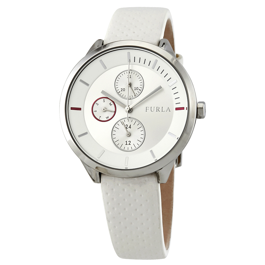 Silver-tone stainless steel case with a white leather strap. Fixed silver-tone stainless steel bezel. Silver-tone dial with silver-tone hands and index hour markers. Minute markers around the outer rim. Dial Type: Analog. Three - day of the week, date and 24 hour subdials. Quartz movement. Scratch resistant mineral crystal. Pull / push crown. Solid case back. Round case shape, case size: 38 mm, case thickness: 7.62 mm. Band width: 18 mm. Buckle clasp. Water resistant at 50 meters / 165 feet. Functions: date, day, hour, minute, second, 24 hour. Casual watch style. Watch label: Japan Movt. Furla Metropolis Silver Dial Ladies Watch R4251102520.