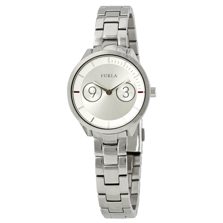 Stainless steel case with a stainless steel bracelet. Fixed stainless steel bezel. Silver dial with silver-tone hands and index hour markers. Minute markers around the outer rim. Dial Type: Analog. Caliber Y120EY quartz movement. Scratch resistant mineral crystal. Pull / push crown. Solid case back. Round case shape. Case size: 31 mm. Case thickness: 7.57 mm. Band width: 18 mm. Deployment with push button release clasp. Water resistant at 50 meters / 165 feet. Functions: hour, minute. Casual watch style. Watch label: Japan Movt. Furla Metropolis Silver Dial Ladies Watch R4253102509.