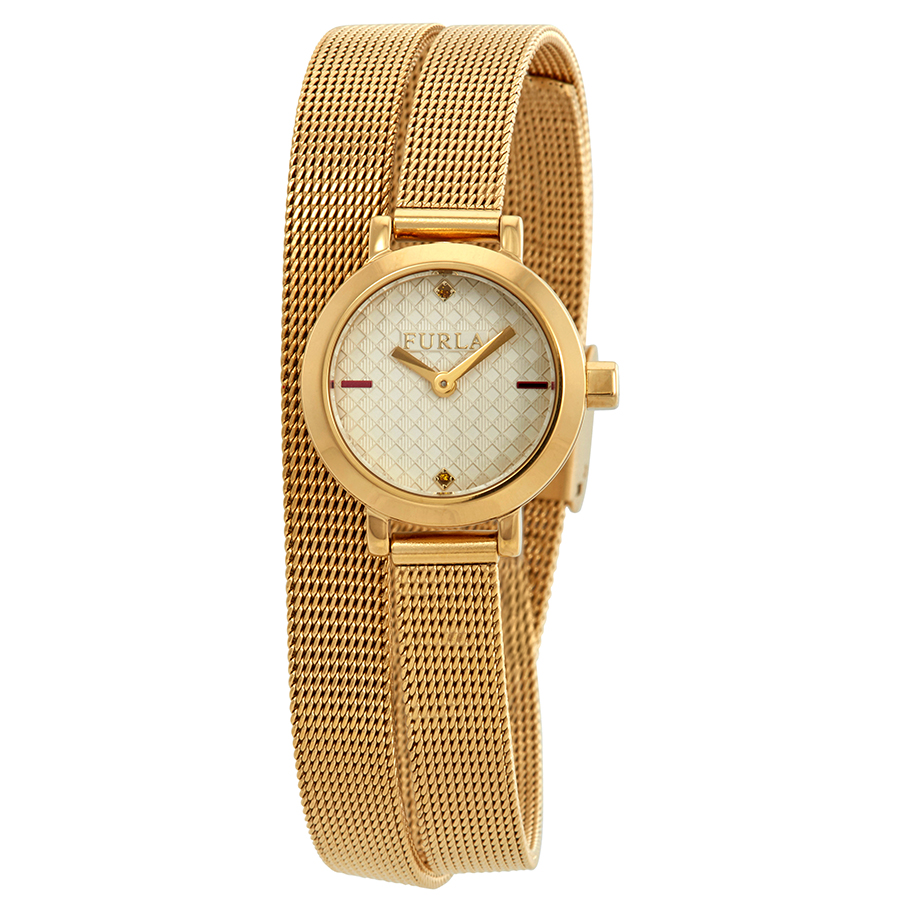 Gold-tone PVD stainless steel case with a gold-tone PVD stainless steel mesh bracelet. Fixed gold-tone PVD stainless steel bezel. Gold-tone dial with gold-tone hands and index and crystal hour markers. Dial Type: Analog. Quartz movement. Scratch resistant mineral crystal. Pull / push crown. Solid case back. Round case shape, case size: 21 mm, case thickness: 7 mm. Band width: 18 mm, band length: 7.5 inches. Fold over clasp. Water resistant at 50 meters / 165 feet. Functions: hour, minute. Dress watch style. Watch label: Japan Movt. Furla Vittoria Gold Dial Ladies Watch R4253107501.