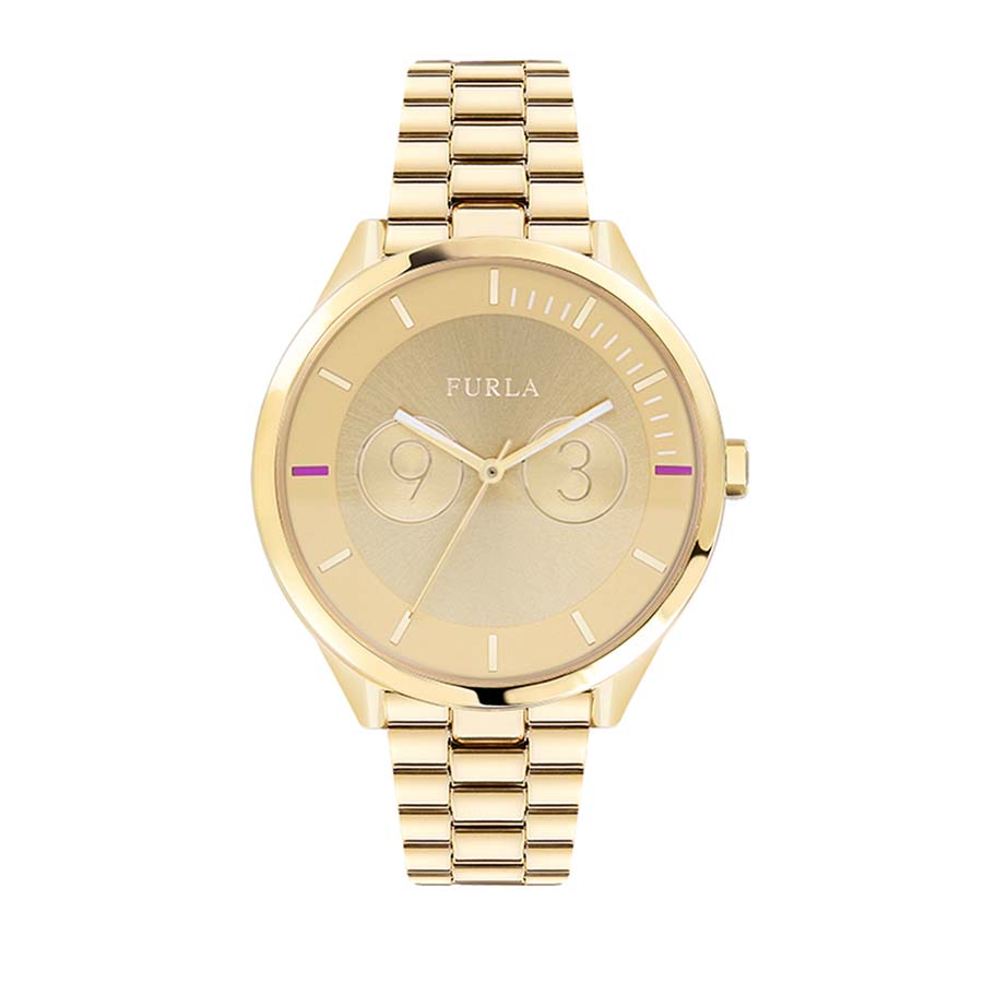 Gold-tone stainless steel case with a gold-tone stainless steel bracelet. Fixed gold-tone stainless steel bezel. Gold dial with gold-tone hands and index hour markers. Dial Type: Analog. Quartz movement. Scratch resistant mineral crystal. Push/pull crown. Solid case back. Round case shape, case size: 38 mm, case thickness: 8.0 mm. Band width: 18 mm, band length: 7.5 inches. Deployment with push button clasp. Water resistant at 30 meters / 99 feet. Functions: hour, minute, second. Casual watch style. Furla Metropolis Gold Dial Ladies Watch R4253102504.