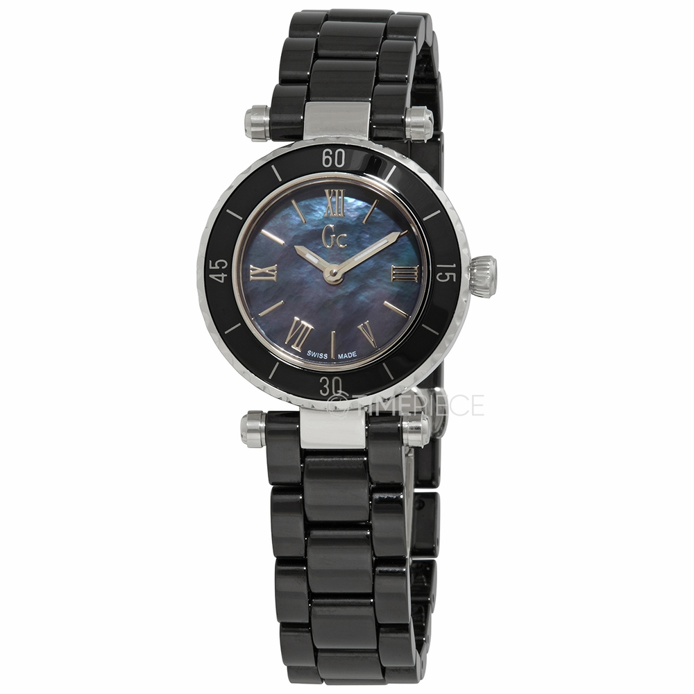 Stainless steel case with a black ceramic bracelet. Fixed stainless steel bezel with an inlaid black ceramic ring. Black dial with silver-tone hands and alternating Roman numeral and index hour markers. Dial Type: Analog. Quartz movement. Scratch resistant sapphire crystal. Pull / push crown. Solid case back. Round case shape. Case size: 28 mm. Case thickness: 9 mm. Band width: 14 mm. Fold over clasp with a push button release. Water resistant at 100 meters / 330 feet. Functions: hour, minute, second. Mini Chic Ceramic Series. Casual watch style. Watch label: Swiss Made. GC by Guess Mini Chic Ceramic Quartz Black Dial Ladies Watch X70012L2S.