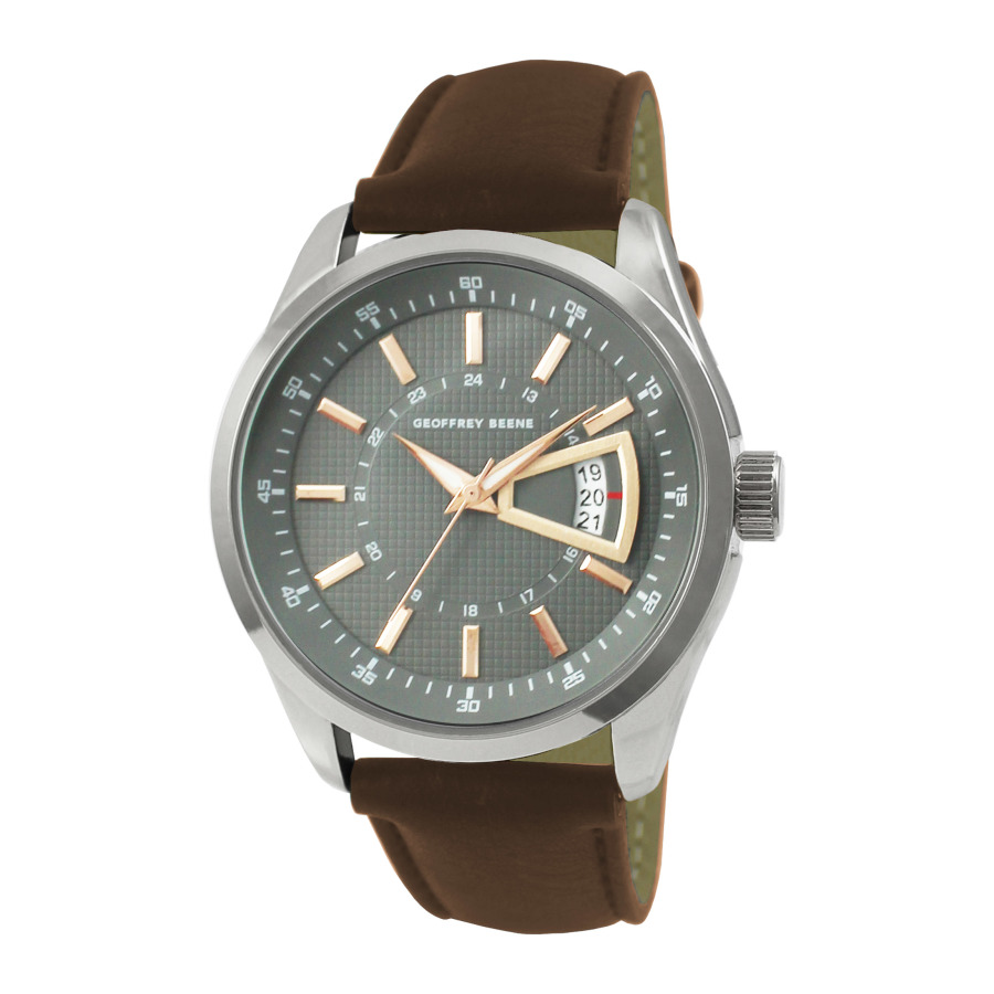 Silver-tone stainless steel case with a brown leather strap. Fixed silver-tone bezel. Grey dial with rose gold-tone hands and index hour markers. Minute markers around the outer rim. Dial Type: Analog. Date display at the 3 o'clock position. Quartz movement. Pull / push crown. Round case shape. Case size: 42 mm. Functions: date, hour, minute, second. Dress watch style. Watch label: Japan Movt. Geoffrey Beene Quartz Grey Dial Mens Watch GB8144SL.