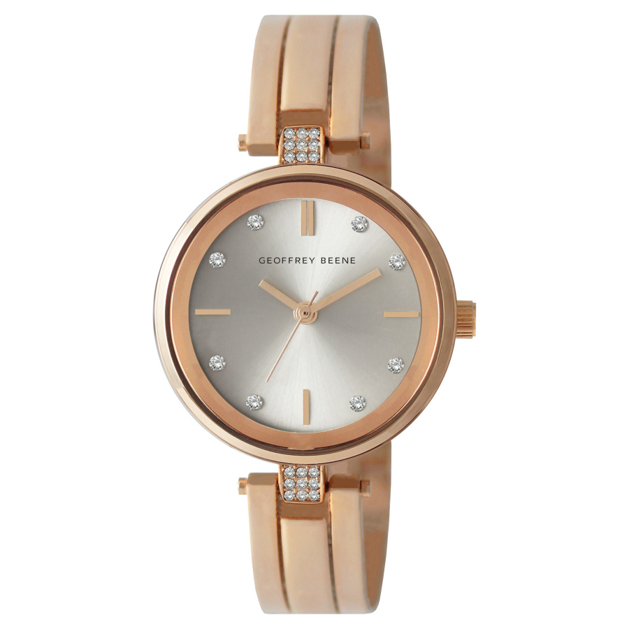 Rose gold-tone stainless steel case with a beige alloy bracelet. Rhinestone set lugs. Fixed rose gold-tone bezel. Silver dial with rose gold-tone hands and rhinestone hour markers. Index markers at the 3, 6, 9 and 12 o'clock positions. Dial Type: Analog. Quartz movement. Scratch resistant mineral crystal. Push / pull crown. Solid case back. Round case shape. Case size: 35 mm. Jewelry clasp. Water resistant at 30 meters / 100 feet. Functions: hour, minute, second. Dress watch style. Watch label: Japan Movt. Geoffrey Beene Quartz Silver Dial Ladies Watch GL0008RG.