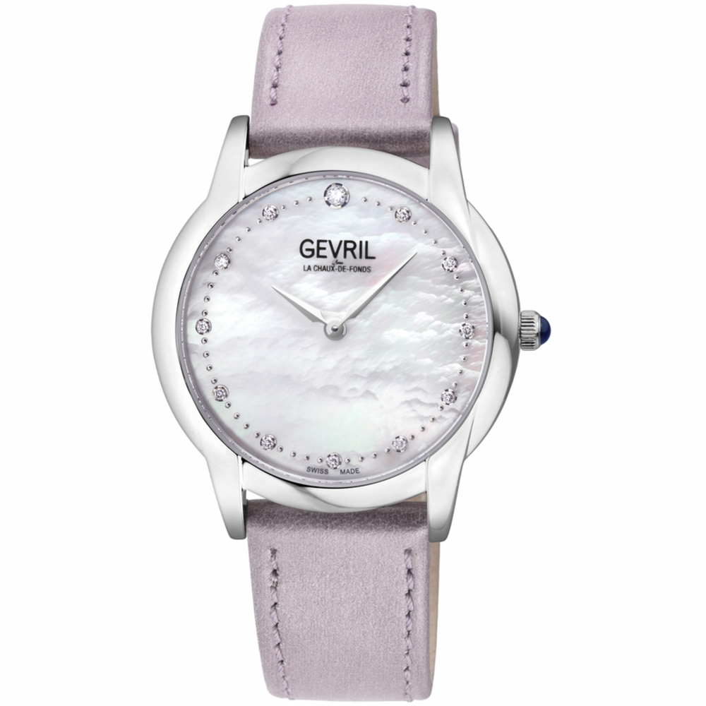 Silver-tone stainless steel case with a purple leather strap. Fixed silver-tone stainless steel bezel. Mother of pearl dial with silver-tone hands and diamond hour markers. Minute markers around the outer rim. Dial Type: Analog. Ronda Caliber 762 quartz movement. Scratch resistant sapphire crystal. Pull / push crown. Solid case back. Round case shape, case size: 36 mm, case thickness: 7.5 mm. Band width: 18 mm. Buckle clasp. Water resistant at 50 meters / 165 feet. Functions: hour, minute. Additional Info: 12 cultured diamonds, crown with blue cabochon stone. Airolo Series. Luxury watch style. Watch label: Swiss Made. Gevril Airolo Diamond Mother of Pearl Dial Ladies Watch 13041.