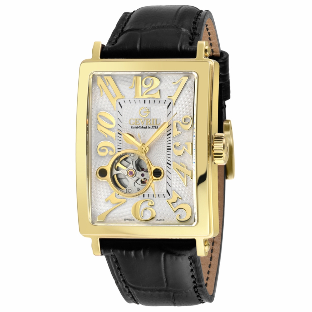 Yellow gold-tone stainless steel case with a black leather strap. Fixed yellow gold-tone stainless steel bezel. White dial with yellow gold-tone hands and Arabic numeral hour markers. Tachymeter scale around the outer rim. Dial Type: Analog. Automatic movement. Scratch resistant sapphire crystal. Pull / push crown. Transparent case back. Rectangle case shape, case size: 44 mm, case thickness: 14 mm. Band width: 23 mm. Buckle clasp. Water resistant at 50 meters / 165 feet. Functions: hour, minute, second. Additional Info: open heart movement. Avenue Of Americas Intravedere Series. Luxury watch style. Watch label: Swiss Made. Gevril Avenue of Americas Intravedere White Dial Mens Watch 5173-2.