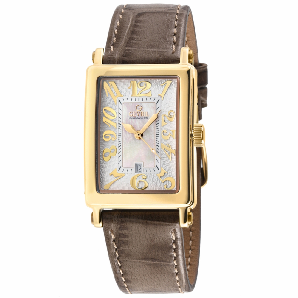 Yellow gold-tone stainless steel case with a tan genuine leather strap. Fixed yellow gold-tone stainless steel bezel. Mother of pearl dial with yellow gold-tone hands and Arabic numeral hour markers. Minute scale around the inner rim. Dial Type: Analog. Date display at the 6 o'clock position. Quartz movement. Scratch resistant sapphire crystal. Pull / push crown. Solid case back. Rectangle case shape, case size: 32 mm, case thickness: 9.5 mm. Band width: 16 mm. Buckle clasp. Water resistant at 50 meters / 165 feet. Functions: date, hour, minute, second. Avenue Of Americas Mini Series. Luxury watch style. Watch label: Swiss Made. Gevril Avenue of Americas Mini Quartz Ladies Watch 7444Y-3.