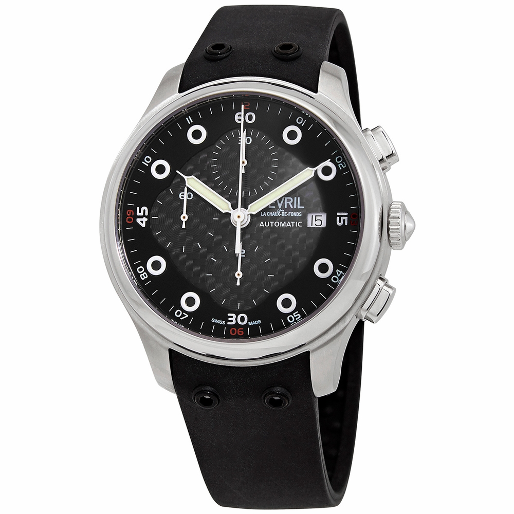Silver-tone stainless steel case with a black rubber strap. Fixed silver-tone stainless steel bezel. Black dial with silver-tone hands and index hour markers. Minute markers around the outer rim. Dial Type: Analog. Luminescent hands. Date display at the 3 o'clock position. Chronograph - three sub-dials displaying: 60 second, 30 minute and 12 hour. Sellita SW500 automatic movement. Scratch resistant sapphire crystal. Pull / push crown. Transparent case back. Round case shape, case size: 42 mm, case thickness: 15 mm. Band width: 18 mm. Deployment with push button release clasp. Water resistant at 50 meters / 165 feet. Functions: chronograph, date, hour, minute, second. Canal St Series. Luxury watch style. Watch label: Swiss Made. Gevril Canal St Black Dial Mens Watch 46102.