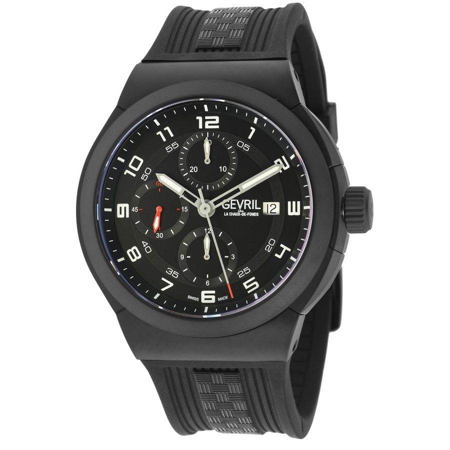 Black-plated stainless steel case with a black rubber strap. Fixed black-plated bezel. Black dial with luminous silver-tone hands and Arabic numeral hour markers. Arabic numeral minute markers (at 5 minute intervals). Minute markers around the outer rim. Dial Type: Analog. Luminescent hands. Date display at the 3 o'clock position. Chronograph - three sub-dials displaying: 60 second, 30 minute and 12 hour. Sellita SW500 automatic movement. Scratch resistant sapphire crystal. Screw down crown. Solid case back. Round case shape. Case size: 46 mm. Case thickness: 15 mm. Band width: 22 mm. Tang clasp. Water resistant at 50 meters / 165 feet. Functions: chronograph, date, hour, minute, second. Canal St Series. Luxury watch style. Watch label: Swiss Made. Gevril Canal St Black Dial Black Rubber Mens Watch 46105.