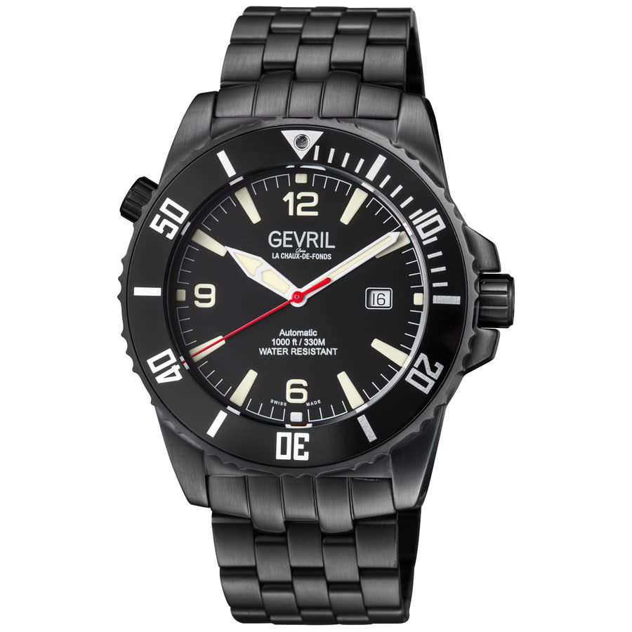 Black stainless steel case and bracelet. Uni-directional rotating black stainless steel bezel. Black dial with white sword & pensil-shaped style hands and Arabic numeral & index hour markers. Minute markers around the outer rim. Dial Type: Analog. Luminescent hands and markers. Date display at the 3 o'clock position. Sellita Caliber SW200 Automatic movement, containing 26 Jewels, bitting at 28800 vph, and has a power reserve of approximately 38 hours. Scratch resistant sapphire crystal. Screw down crown. Solid case back. Round case shape, case size: 45 mm, case thickness: 13 mm. Band width: 20 mm. Deployment with push button release clasp. Water resistant at 300 meters / 1000 feet. Functions: date, hour, minute, second, helium release at 10 o'clock. Additional Info: divers watch, screw down helium release valve. Canal St Divers Series. Luxury watch style. Watch label: Swiss Made. Gevril Canal St Divers Automatic Black Dial Mens Watch 46008.