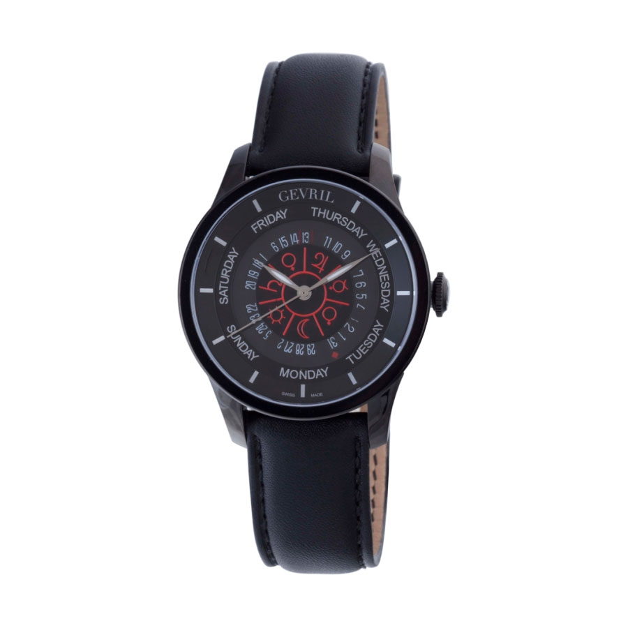 Black stainless steel case with a black italian genuine leather strap. Fixed black stainless steel bezel. Black with seven astrological symbols dial with silver-tone hands and index hour markers. Dial Type: Analog. Luminescent hands. Date and day display. ETA Caliber 2834-2 Automatic movement, containing 25 Jewels, bitting at 28800 vph, and has a power reserve of approximately 38 hours. Scratch resistant sapphire crystal. Pull / push crown. Picture of columbus circle engraved with exhibition window case back. Round case shape, case size: 45 mm, case thickness: 12 mm. Band width: 22 mm. Buckle clasp. Water resistant at 50 meters / 165 feet. Functions: date, day, hour, minute, second. Additional Info: limited edition - 150 pieces. Columbus Circle Series. Casual watch style. Watch label: Swiss Made. Gevril Columbus Circle Black Dial Automatic Black Leather Mens Watch 2001.