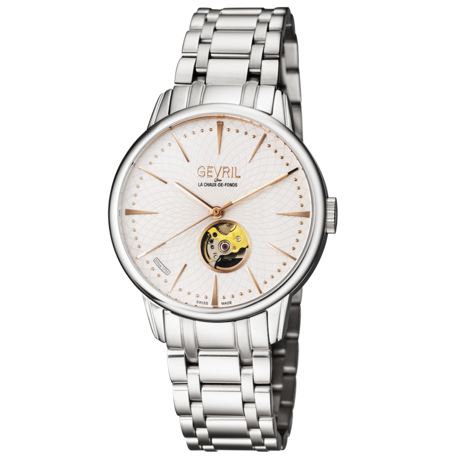 Silver-tone stainless steel case with a silver-tone stainless steel bracelet. Fixed silver-tone stainless steel bezel. Beige dial with gold-tone hands and index hour markers. Minute markers around the outer rim. Dial Type: Analog. Ruben & Sons Caliber MD3G automatic movement with a 42-hour power reserve. Scratch resistant sapphire crystal. Pull / push crown. Transparent case back. Round case shape, case size: 43 mm, case thickness: 13 mm. Band width: 22 mm, band length: 9.5 inches. Butterfly clasp. Water resistant at 50 meters / 165 feet. Functions: hour, minute, second. Casual watch style. Watch label: Swiss Made. Gevril Fashion Beige Dial Mens Watch 9601B.