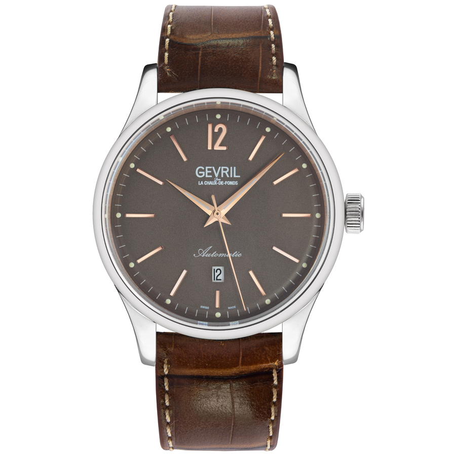 Silver-tone stainless steel case with a brown leather strap. Fixed silver-tone stainless steel bezel. Grey dial with rose gold-tone dauphine-style shape hands and Arabic numeral & index hour markers. Minute markers around the outer rim. Dial Type: Analog. Luminescent hands and markers. Date display at the 6 o'clock position. Automatic movement. Scratch resistant sapphire crystal. Pull / push crown. Transparent see through case back. Round case shape, case size: 43 mm, case thickness: 13 mm. Band width: 22 mm. Buckle clasp. Water resistant at 50 meters / 165 feet. Functions: date, hour, minute, second. Five Point Series. Luxury watch style. Watch label: Swiss Made. Gevril Five Point Automatic Grey Dial Mens Watch 4259A.