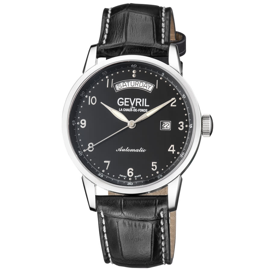 Silver-tone stainless steel case with a black leather strap. Fixed silver-tone stainless steel bezel. Black dial with silver-tone hands and Arabic numeral & index hour markers. Minute markers around the outer rim. Dial Type: Analog. Luminescent hands. Date display at the 3 o'clock position. Automatic movement. Scratch resistant sapphire crystal. Pull / push crown. Transparent case back. Round case shape, case size: 42 mm, case thickness: 11.5 mm. Band width: 21 mm. Buckle clasp. Water resistant at 50 meters / 165 feet. Functions: date, day, hour, minute, second. Additional Info: day of the week display at the 12 o'clock position. Five Points Series. Luxury watch style. Watch label: Swiss Made. Gevril Five Points Automatic Black Dial Mens Watch 461002.