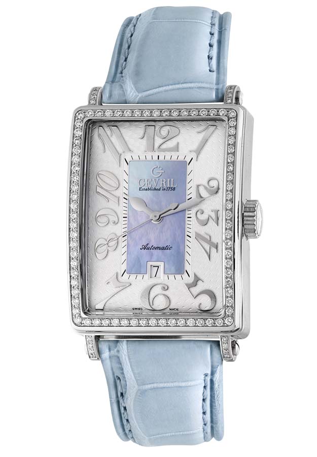 Silver-tone stainless steel case with a blue calfskin leather strap. Fixed silver-tone crystal set bezel. Blue dial with silver-tone hands and Arabic numeral hour markers. Minute scale around the inner rim. Dial Type: Analog. Date display at the 6 o'clock position. Automatic movement. Scratch resistant antireflective sapphire crystal. Push/pull crown. Solid case back. Rectangle case shape, case size: 34 x 44 mm, case thickness: 12 mm. Band width: 23 mm, band length: 7.5 inches. Buckle clasp. Water resistant at 50 meters / 165 feet. Functions: date, hour, minute, second. Casual watch style. Watch label: Swiss Made. Gevril Glamour Automatic Ladies Watch 6207NL.