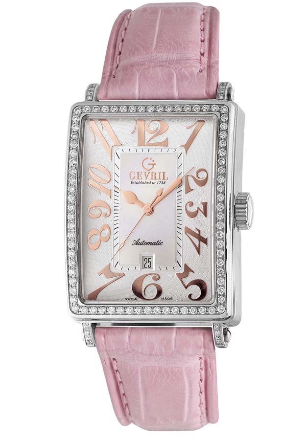 Silver-tone stainless steel case with a pink calfskin leather strap. Fixed silver-tone crystal set bezel. Pink dial with gold-tone hands and Arabic numeral hour markers. Minute scale around the inner rim. Dial Type: Analog. Date display at the 6 o'clock position. Automatic movement. Scratch resistant antireflective sapphire crystal. Push/pull crown. Solid case back. Rectangle case shape, case size: 34 44 mm, case thickness: 12 mm. Band width: 23 mm, band length: 7.5 inches. Buckle clasp. Water resistant at 50 meters / 165 feet. Functions: date, hour, minute, second. Casual watch style. Watch label: Swiss Made. Gevril Glamour Automatic Pink Dial Ladies Watch 6208RL.