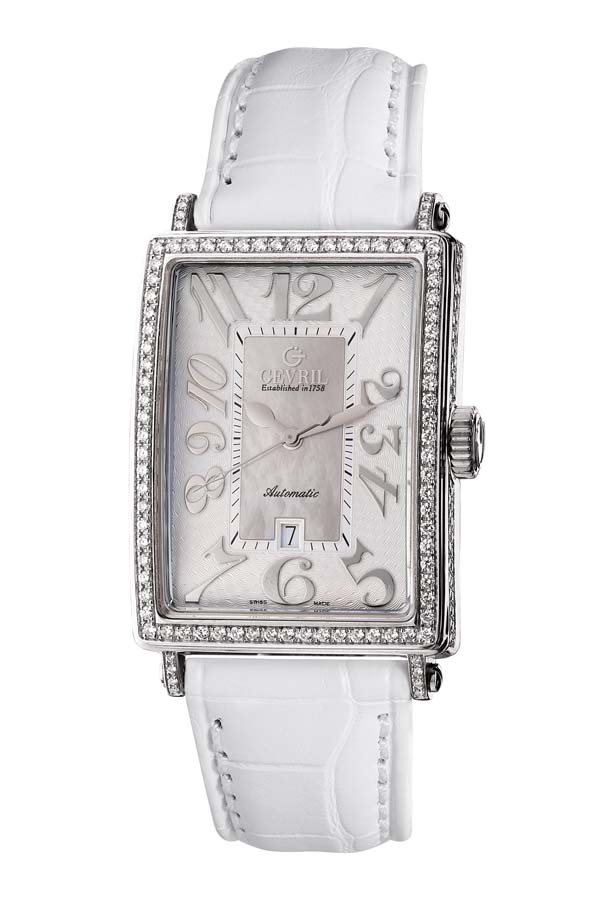 Silver-tone stainless steel case with a white calfskin leather strap. Fixed silver-tone crystal set bezel. White dial with silver-tone hands and Arabic numeral hour markers. Minute scale around the inner rim. Dial Type: Analog. Date display at the 6 o'clock position. Automatic movement. Scratch resistant antireflective sapphire crystal. Push/pull crown. Solid case back. Rectangle case shape, case size: 34 x 44 mm, case thickness: 12 mm. Band width: 23 mm, band length: 7.5 inches. Buckle clasp. Water resistant at 50 meters / 165 feet. Functions: date, hour, minute, second. Casual watch style. Watch label: Swiss Made. Gevril Glamour Automatic White Dial Ladies Watch 6209NV.