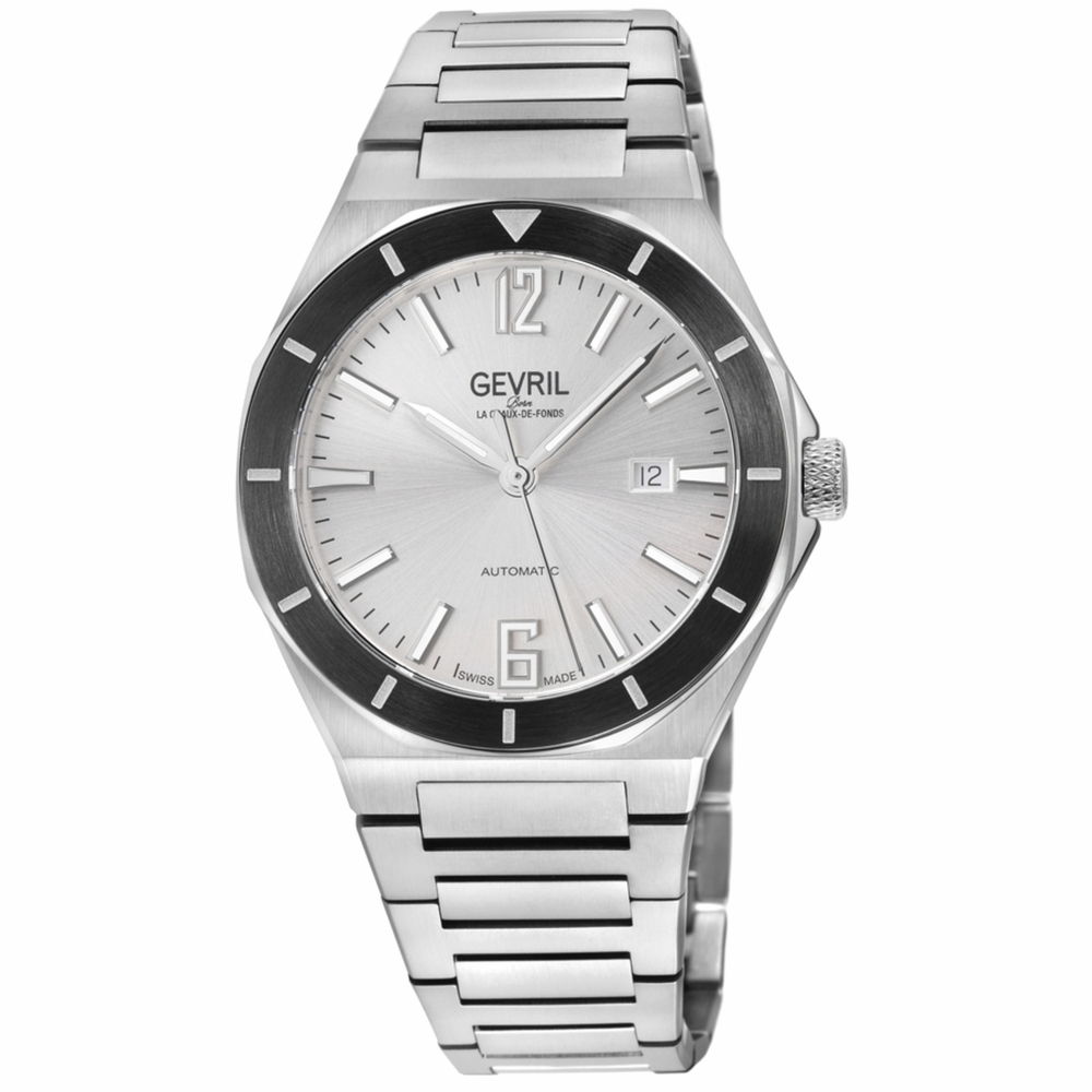 Silver-tone stainless steel case and bracelet. Fixed black stainless steel bezel. Silver-tone dial with silver-tone hands and Arabic numeral hour markers. Minute markers around the outer rim. Dial Type: Analog. Luminescent hands and markers. Date display at the 3 o'clock position. Sellita Caliber SW200 Automatic movement, containing 26 Jewels, bitting at 28800 vph, and has a power reserve of approximately 38 hours. Scratch resistant sapphire crystal. Pull / push crown. Transparent see through case back. Round case shape, case size: 43 mm, case thickness: 12 mm. Band width: 20 mm. Deployment with push button release clasp. Water resistant at 100 meters / 330 feet. Functions: date, hour, minute, second. High Line Series. Luxury watch style. Watch label: Swiss Made. Gevril High Line Automatic Silver Dial Mens Watch 48404B.
