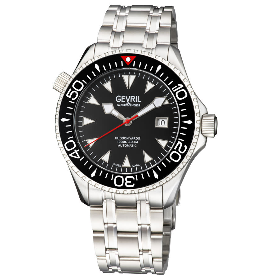 Silver-tone stainless steel case and bracelet. Uni-directional rotating black stainless steel bezel. Black dial with silver-tone hands and index hour markers. Minute markers around the outer rim. Dial Type: Analog. Luminescent hands and markers. Date display at the 3 o'clock position. Sellita SW200 automatic movement. Scratch resistant sapphire crystal. Screw down crown. Transparent case back. Round case shape, case size: 43 mm, case thickness: 14 mm. Band width: 20 mm. Deployment with push button release clasp. Water resistant at 300 meters / 1000 feet. Functions: date, hour, minute, second. Additional Info: divers, screw down helium release valve. Hudson Yards Series. Luxury watch style. Watch label: Swiss Made. Gevril Hudson Yards Automatic Black Dial Mens Watch 48800.