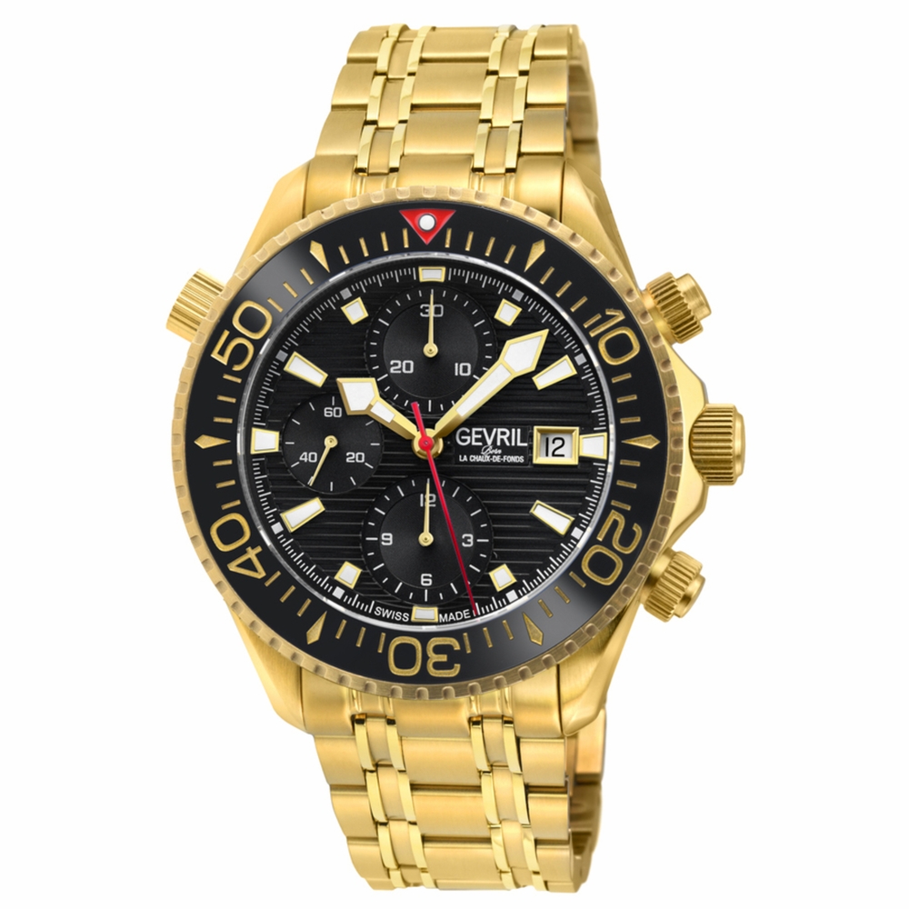 Yellow gold-tone stainless steel case and bracelet. Uni-directional rotating yellow gold-tone stainless steel bezel. Black dial with yellow gold-tone hands and index hour markers. Minute markers around the outer rim. Dial Type: Analog. Luminescent hands and markers. Date display at the 3 o'clock position. Chronograph - three sub-dials displaying: 60 second, 30 minute and 12 hour. Sellita Caliber SW500 Automatic movement, containing 25 Jewels, bitting at 28800 vph, and has a power reserve of approximately 44 hours. Scratch resistant sapphire crystal. Screw down crown. Transparent case back. Round case shape, case size: 43 mm, case thickness: 17 mm. Band width: 20 mm. Deployment with push button release clasp. Water resistant at 300 meters / 1000 feet. Functions: chronograph, date, day, hour, minute, small second. Additional Info: helium release valve, chronograph. Hudson Yards Chronograph Series. Luxury watch style. Watch label: Swiss Made. Gevril Hudson Yards Chronograph Automatic Black Dial Mens Watch 48811B.