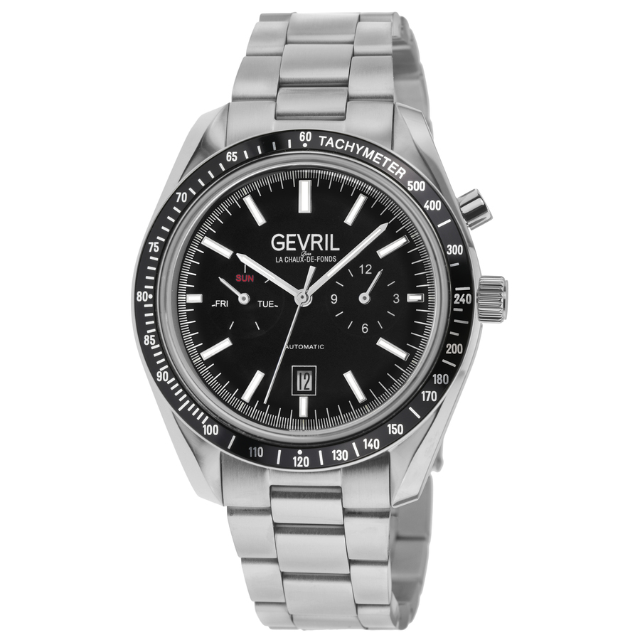 Silver-tone stainless steel case and bracelet. Fixed tachymeter scale black stainless steel bezel. Black dial with silver-tone hands and index hour markers. Minute markers around the outer rim. Dial Type: Analog. Luminescent hands and markers. Date display at the 6 o'clock position. Automatic movement. Scratch resistant sapphire crystal. Screw down crown. Transparent case back. Round case shape, case size: 44 mm, case thickness: 14 mm. Band width: 18 mm. Deployment with push button release clasp. Water resistant at 50 meters / 165 feet. Functions: date, day, hour, minute, second. Additional Info: tachymeter, multi function month day and date indicator. Lenox Series. Luxury watch style. Watch label: Swiss Made. Gevril Lenox Automatic Black Dial Mens Watch 49002.