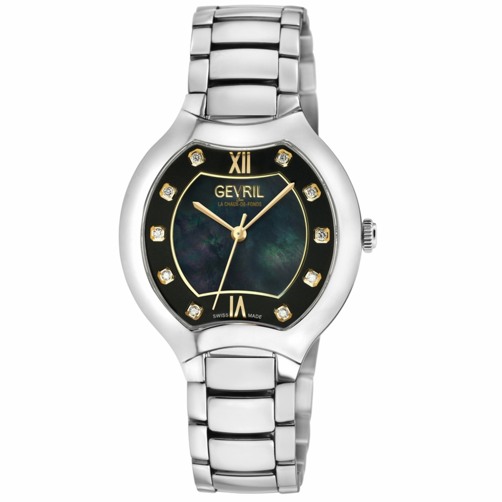 Silver-tone stainless steel case and bracelet. Fixed silver-tone stainless steel bezel. Mother of pearl dial with yellow gold-tone hands and Roman numeral hour markers. Dial Type: Analog. Ronda Caliber 763 quartz movement. Scratch resistant sapphire crystal. Pull / push crown. Solid case back. Cushion case shape, case size: 35 mm, case thickness: 9 mm. Band width: 16 mm. Deployment with push button release clasp. Water resistant at 50 meters / 165 feet. Functions: hour, minute, second. Additional Info: 10 cultured diamonds. Lugano Series. Luxury watch style. Watch label: Swiss Made. Gevril Lugano Mother of Pearl Dial Ladies Watch 11047B.