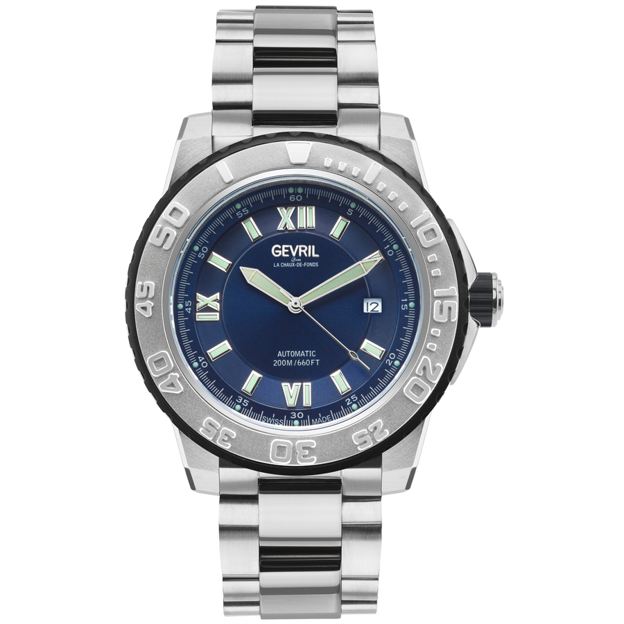 Stainless steel case with a stainless steel bracelet. Uni-directional rotating black-plated bezel with silver-yone ring. Blue dial with luminous silver-tone sword-shaped hands and index hour markers. Roman numerals mark the 6, 9 and 12 o'clock positions. Minute markers around the outer rim. Dial Type: Analog. Luminescent hands and markers. Date display at the 3 o'clock position. Automatic movement with a 20-hour power reserve. Scratch resistant sapphire crystal. Screw down crown. Solid case back. Round case shape. Case size: 45 mm. Case thickness: 14 mm. Band width: 22 mm. Deployment clasp with a push button release. Water resistant at 200 meters / 660 feet. Functions: date, hour, minute, second. Fashion watch style. Watch label: Swiss Made. Gevril Seacloud Automatic Blue Dial Mens Watch 3120B.