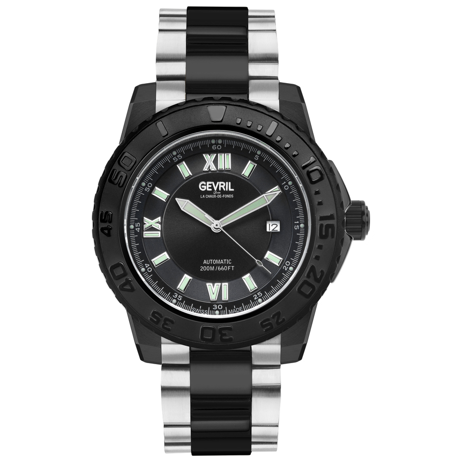 . Black-plated stainless steel case with a two-tone (silver-tone and black-plated) stainless steel bracelet. Uni-directional rotating black-plated bezel with a black ring. Black dial with luminous silver-tone sword-shaped hands and index hour markers. Roman numerals appear at the 6, 9 and 12 o'clock positions. Arabic numeral minute markers (at 5 minute intervals). Minute markers around the outer rim. Dial Type: Analog. Luminescent hands and markers. Date display at the 3 o'clock position. Automatic movement with a 20-hour power reserve. Scratch resistant sapphire crystal. Screw down crown. Solid case back. Round case shape. Case size: 45 mm. Case thickness: 14 mm. Band width: 22 mm. Deployment clasp with a push button release. Water resistant at 200 meters / 660 feet. Functions: hour, minute, second. Seacloud Series. Fashion watch style. Watch label: Swiss Made. Gevril Seacloud Automatic Black Dial Mens Watch 3121B.